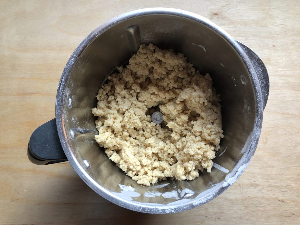 • Den Mixer in kurzen Intervallen laufen lassen, bis eine sandige, krümelige Masse entsteht. Ich empfehle, nach Augenmaß vorzugehen – ich habe mit dem Thermomix auf Stufe 4 gearbeitet.