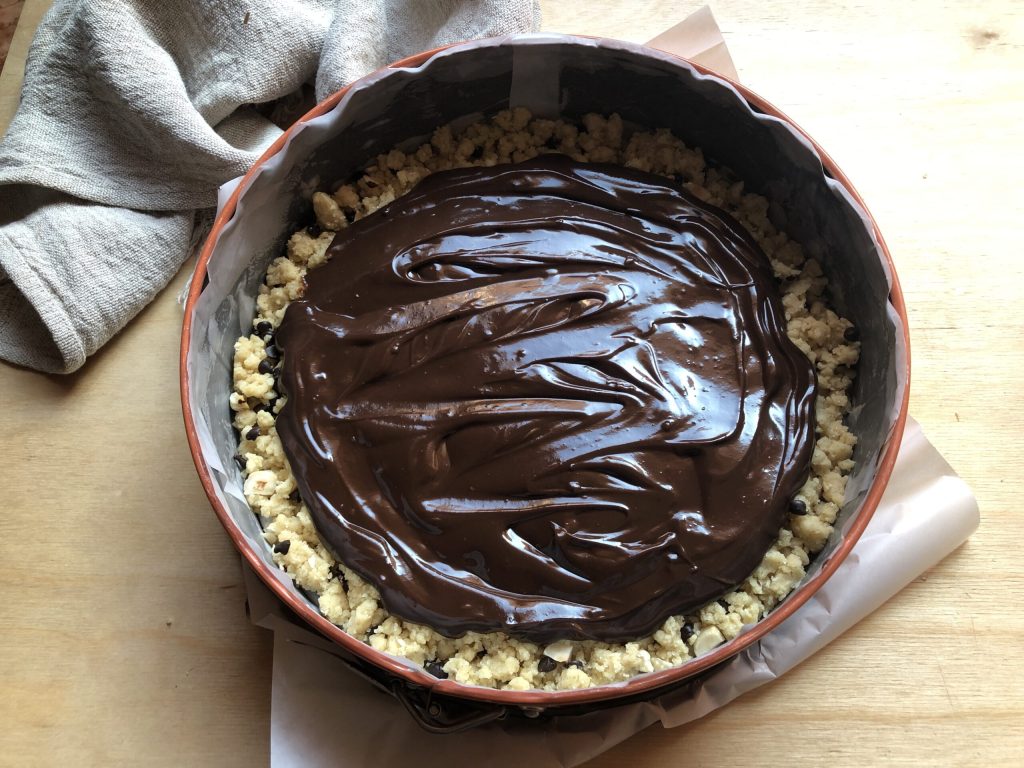 Heute möchte ich ein tolles Rezept mit euch teilen. Es handelt sich um die Cookie-Torte, ein Dessert, das von den berühmten Chocolate-Chip-Cookies aus Amerika inspiriert ist – diese mit Schokotropfen, die alle glücklich machen. Die Zubereitung ist in wenigen Schritten erledigt: Haselnüsse und Schokotropfen werden in einen krümeligen Mürbteig eingearbeitet. Die Hälfte des Teigs kommt in die Springform, darauf eine weiche, umhüllende Schokoladencreme und zum Schluss der restliche Teig. Alles sehr rustikal, keine Komplikationen, aber umso mehr Genuss. Diese Torte ist super verlockend, ideal für alle, die Desserts zum Teilen lieben – die Art von Kuchen, die alle in die Küche zieht und schnell verschwunden ist. Perfekt zum Frühstück, für die Jause oder als Dessert nach dem Essen, aber glaubt mir: sie könnte nicht bis zum nächsten Tag reichen! Also ran an den Ofen und losgelegt. Ich bin mir sicher, ihr werdet es nicht bereuen.