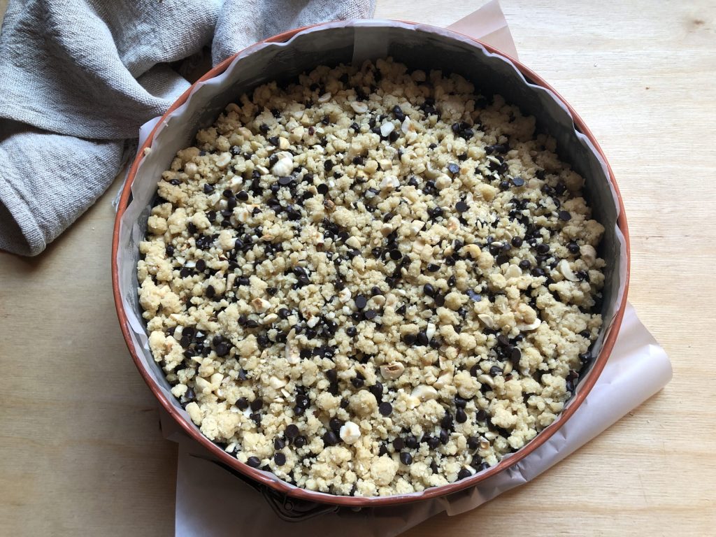 • Jetzt die restlichen Teigkrümel gleichmäßig über die Oberfläche streuen.