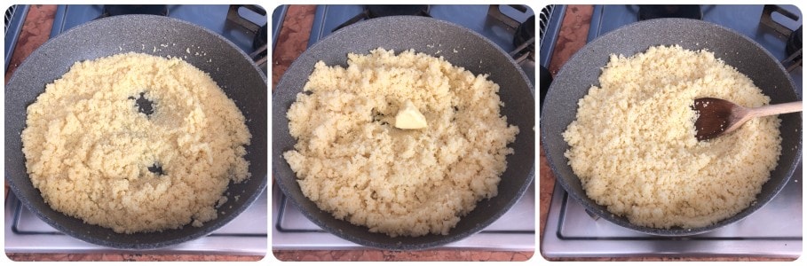 In der Zwischenzeit den Couscous gemäß den Anweisungen auf der Packung rehydrieren. Ich habe 250 ml Wasser in einem anderen Topf gesalzen, einen Esslöffel Öl hinzugefügt und zum Kochen gebracht. Dann habe ich den Couscous hinzugefügt und die Hitze ausgeschaltet. Ich ließ ihn etwa 3/4 Minuten lang das Wasser aufnehmen und lockerte ihn dann mit einem Holzlöffel oder einer Gabel auf. Dann fügte ich ein Stück Butter hinzu, schaltete die Hitze wieder ein und beendete das Kochen bei sehr schwacher Hitze für weitere 3/4 Minuten, dabei gelegentlich umrühren.