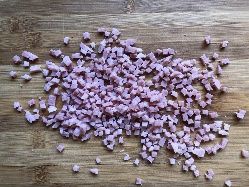 • Die Scheiben des gekochten Schinkens in kleine Würfel schneiden.