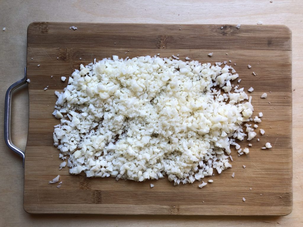 Die Blumenkohlröschen 15 Minuten dampfgaren (nach dem Garen sollten sie noch etwas knackig sein), dann hacken (ich habe einen Wiegemesser benutzt).