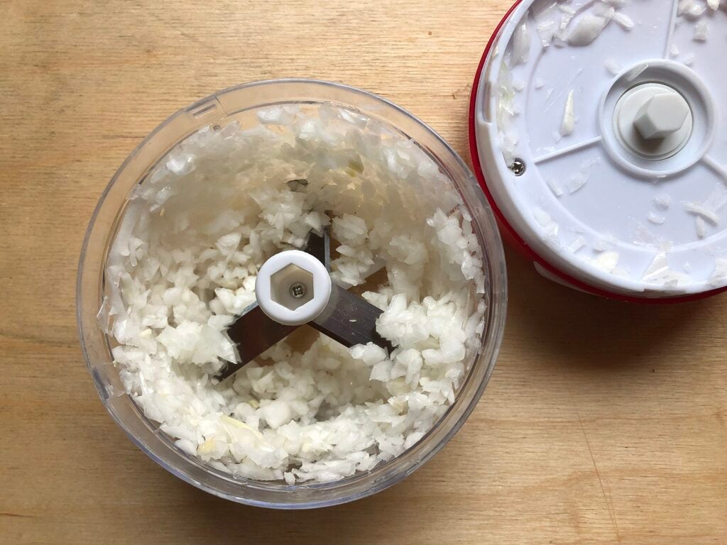 Die Frühlingszwiebeln putzen, die Wurzeln und harten grünen Blätter entfernen, dann fein hacken. Ich habe einen manuellen Seil-Zerkleinerer benutzt, den ich wirklich sehr praktisch finde. Wenn Sie es kaufen möchten, finden Sie es HIER.