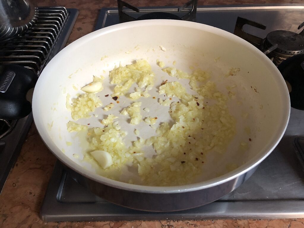 In einem Topf (besser ein Kochtopf, wie oben erklärt) einige Esslöffel Öl erhitzen und die Frühlingszwiebeln zusammen mit einem geschälten, halbierten Knoblauchzehe ohne den inneren Kern anbraten. Fügen Sie auch eine Prise Chilischote hinzu: Sie können es nach Geschmack dosieren.