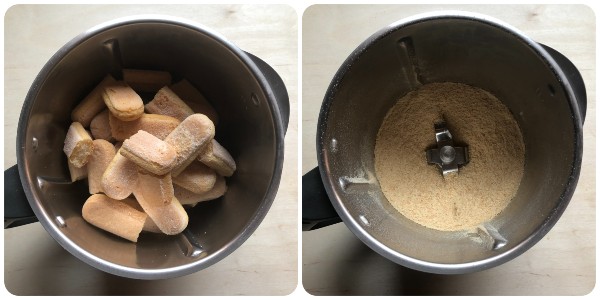 Zerbrechen Sie die Löffelbiskuits und geben Sie sie in einen Zerkleinerer, um sie fein zu mahlen. Ich habe den Thermomix verwendet (5 Sekunden, Geschwindigkeit 6). Beiseite stellen