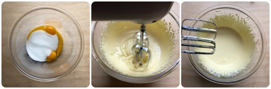 Den restlichen Zucker (140 g) in die Schüssel mit den Eigelben geben und mit dem elektrischen Rührgerät schlagen, bis die Masse hell und schaumig ist.