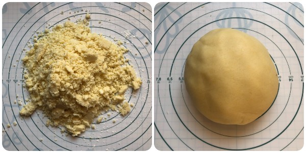 Den erhaltenen Teig auf die Arbeitsfläche geben und mit den Händen kneten, bis er glatt und kompakt ist. Eine Kugel formen, in Frischhaltefolie wickeln und für mindestens eine Stunde im Kühlschrank ruhen lassen.