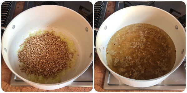 Dann den Dinkel hinzugeben und kurz im Bratansatz anrösten lassen, bevor 1 Liter kochende Brühe in den Topf gegeben wird.