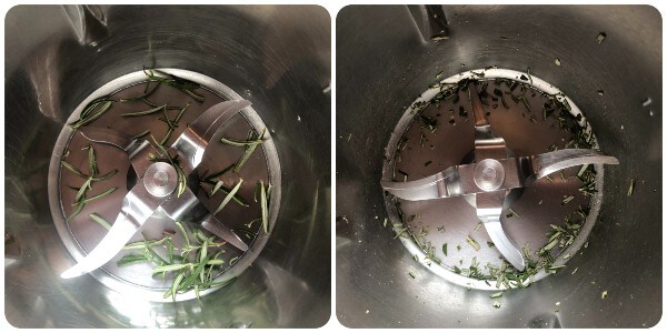 Die Rosmarinnadeln waschen, mit Küchenpapier trocken tupfen und fein hacken: mit dem Thermomix habe ich nach Gefühl, mehrmals auf Geschwindigkeit 7, gearbeitet.