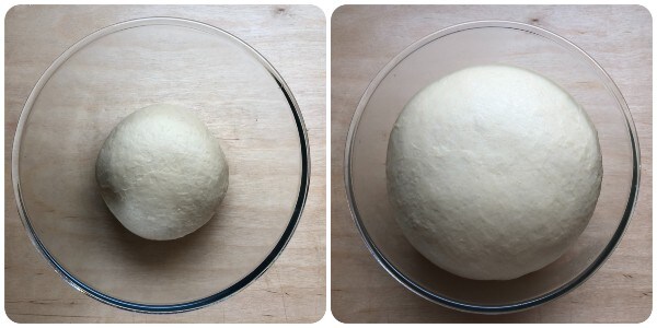 Auf die Arbeitsfläche legen, eine Kugel formen, in eine große Schüssel geben, abdecken und fünf Stunden an einem warmen Ort und geschützt vor Zugluft gehen lassen.
