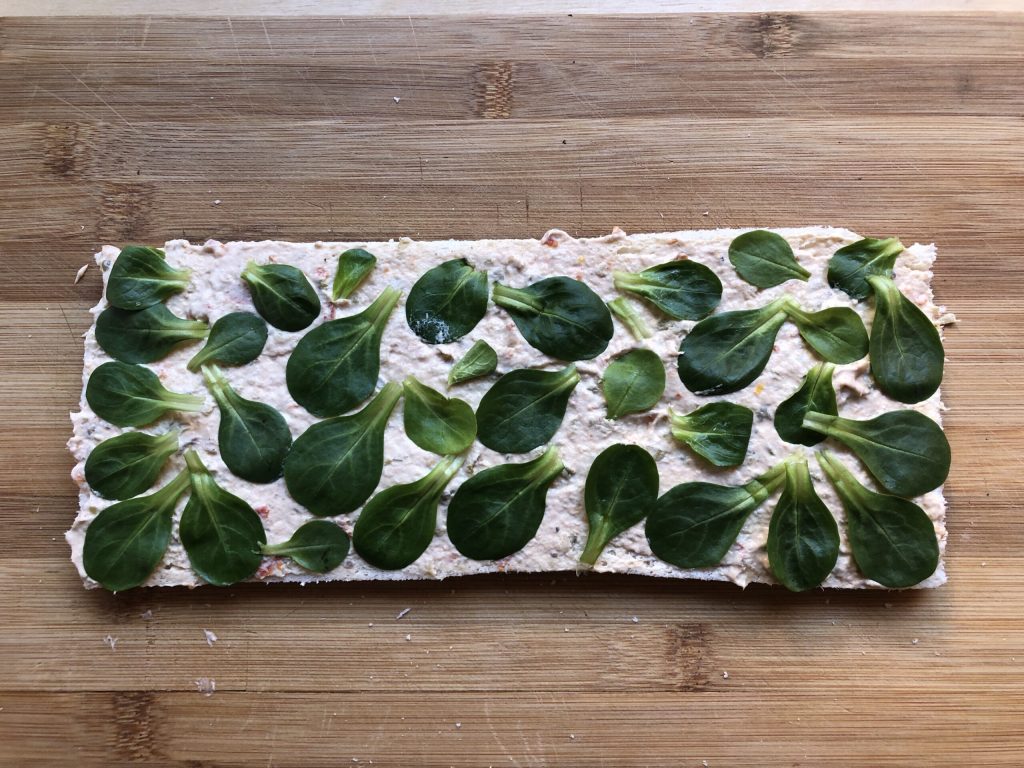 Nun eine Schicht Feldsalatblätter darauflegen.