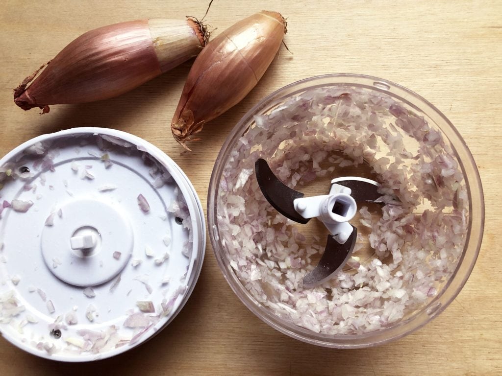 • Die Schalotte schälen und fein hacken. Ich habe einen manuellen Seilchopper verwendet, den ich wirklich sehr praktisch finde. Wenn Sie ihn kaufen möchten, können Sie ihn HIER finden.