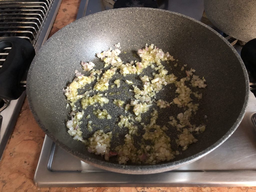 • Schälen Sie die Schalotte und hacken Sie sie fein; dann braten Sie sie in einigen Esslöffeln Öl in einem Topf an.