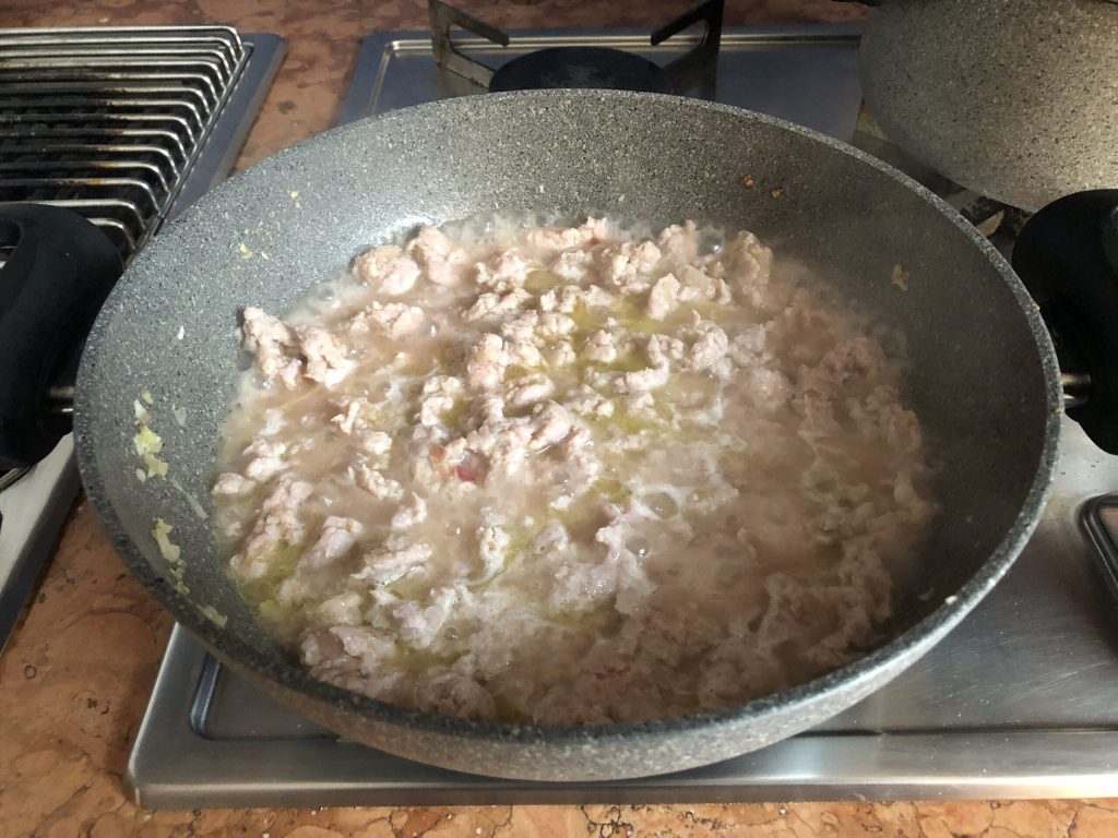• Lassen Sie sie einige Augenblicke brutzeln, dann fügen Sie die beiden Würste hinzu, die zuvor von der Haut befreit und mit einer Gabel zerkleinert wurden.