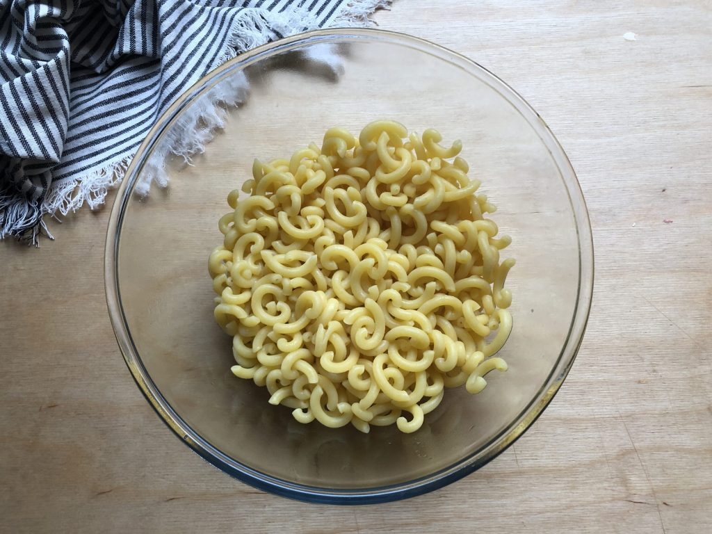 • Gießen Sie diese Eimischung über die gewürzte und abgekühlte Pasta und mischen Sie alles gut miteinander.