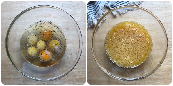 • Schlagen Sie die Eier in eine andere Schüssel, würzen Sie sie mit Salz und Pfeffer nach Belieben und schlagen Sie sie mit einem kleinen Schneebesen, bis die Eigelbe und die Eiweiße gut vermischt sind.