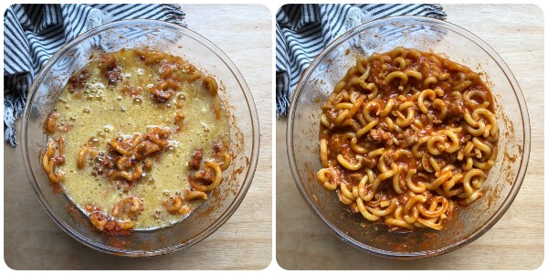 • Wenn die Tomaten-Wurst-Soße fertig ist, geben Sie sie in die Schüssel mit der Pasta, mischen Sie gut und lassen Sie sie abkühlen.