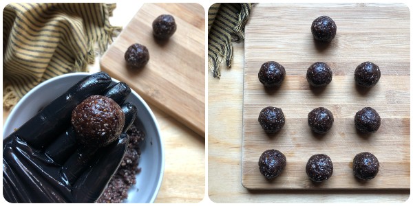 • Dann die weichen Früchte in Stückchen und das ungesüßte Kakaopulver hinzufügen. Zerkleinern, bis eine Masse entsteht, die sich zwischen den Fingern leicht zusammenpresst. Ich habe nach Gefühl mit Stufe 6 gearbeitet und die Masse alle 10 Sekunden kontrolliert. Falls nötig, ein oder zwei Teelöffel heißes Wasser zugeben, das hilft der Masse, besser zu binden. Wichtig ist, dabei langsam vorzugehen. Es ist nicht nötig, Zucker oder Honig hinzuzufügen. In dieser Zubereitung ist die natürliche Süße bereits mehr als ausreichend und die Bällchen würden sonst zu süß werden.