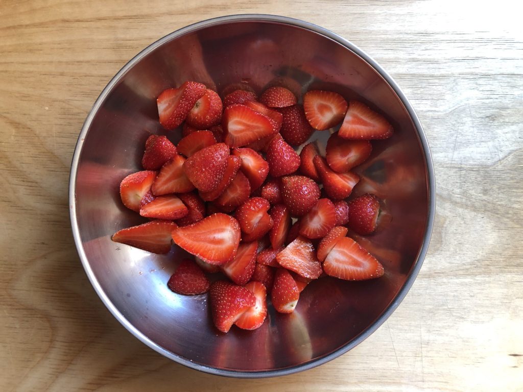 • 350 g Erdbeeren (Gewicht nach dem Abziehen der Abfälle + 2 Erdbeeren zur Enddekoration)
