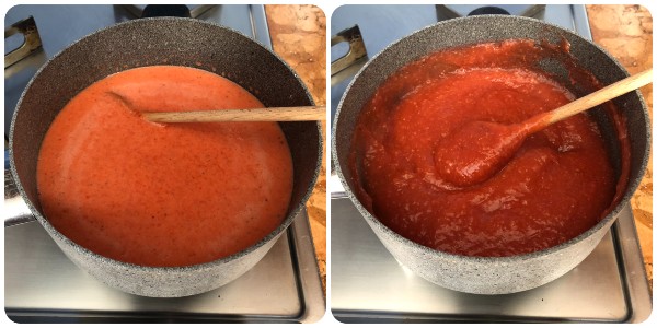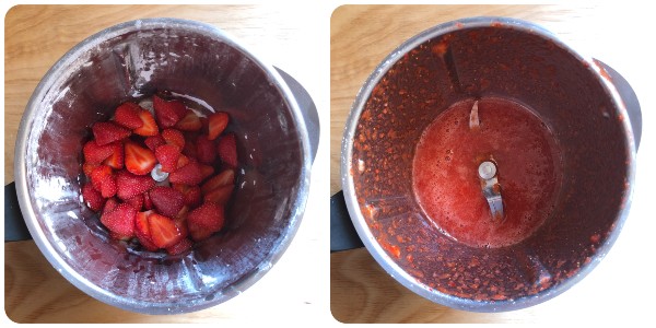 • Dann die Erdbeeren zum Zucker geben und mixen, bis eine homogene Creme entsteht: mit dem Thermomix 25 Sekunden bei Geschwindigkeit 5/6.