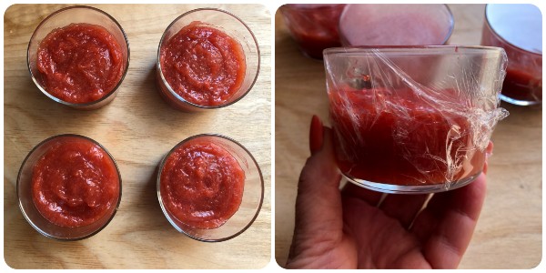 • Vom Herd nehmen und die erhaltene Creme in vier Schälchen gießen. Bei Raumtemperatur abkühlen lassen, dann mit Frischhaltefolie abdecken und für mindestens 2/3 Stunden in den Kühlschrank stellen.