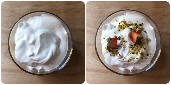 • Die Sahne in den vier Schälchen über der Erdbeercreme verteilen, mit gehackten Pistazien bestreuen und mit ein paar Erdbeerstücken dekorieren.