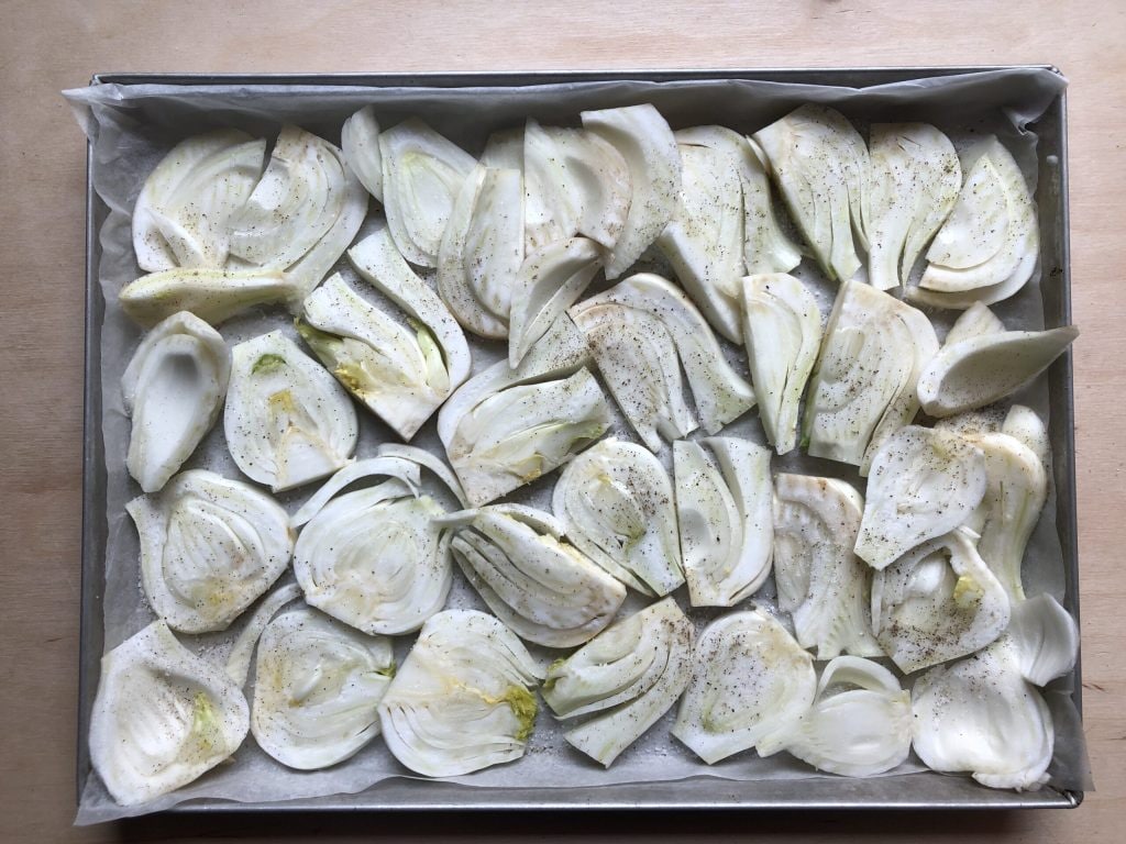 Diese Mischung gleichmäßig über den Fenchel streuen. Zum Schluss alles mit Öl beträufeln.