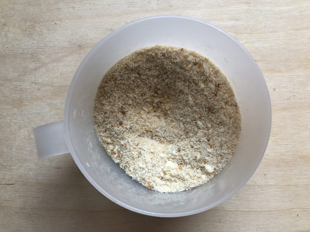 In einer kleinen Schüssel die Semmelbrösel mit dem geriebenen Käse und dem granulierten Knoblauch vermischen. Letzteren könnt ihr nach Belieben dosieren oder weglassen, wenn ihr ihn nicht mögt (aber er passt hervorragend dazu!).