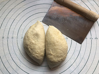 Nach 10 Minuten das Nudelbrett mit Hartweizengrieß bestreuen und den Teig in zwei Teile teilen. Den zweiten Teigstück in Frischhaltefolie gewickelt lassen, während Sie den ersten ausrollen.