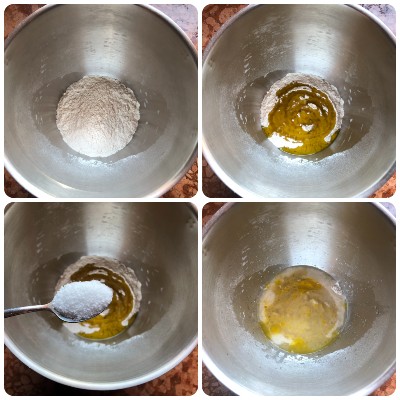 Mehl, Öl, Salz und Wasser in die Schüssel der Küchenmaschine geben. Wenn Sie von Hand kneten, sieben Sie das Mehl durch ein feines Sieb.