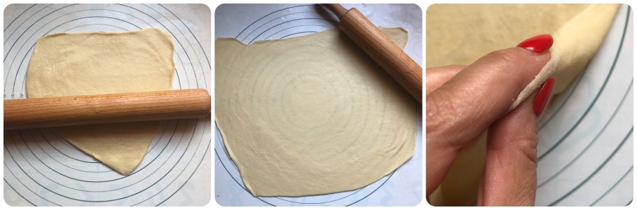 Bei Bedarf mehr Hartweizengrieß hinzufügen und den Teig mit dem Nudelholz sehr dünn ausrollen. Es ist nicht notwendig, ihm eine präzise Form zu geben; wichtig ist, dass er auf das Blech passt.