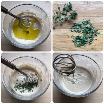 Auch das Öl und den grob gehackten Majoran hinzufügen. Alles gut vermengen, bis ein glatter und klumpenfreier Teig entsteht.