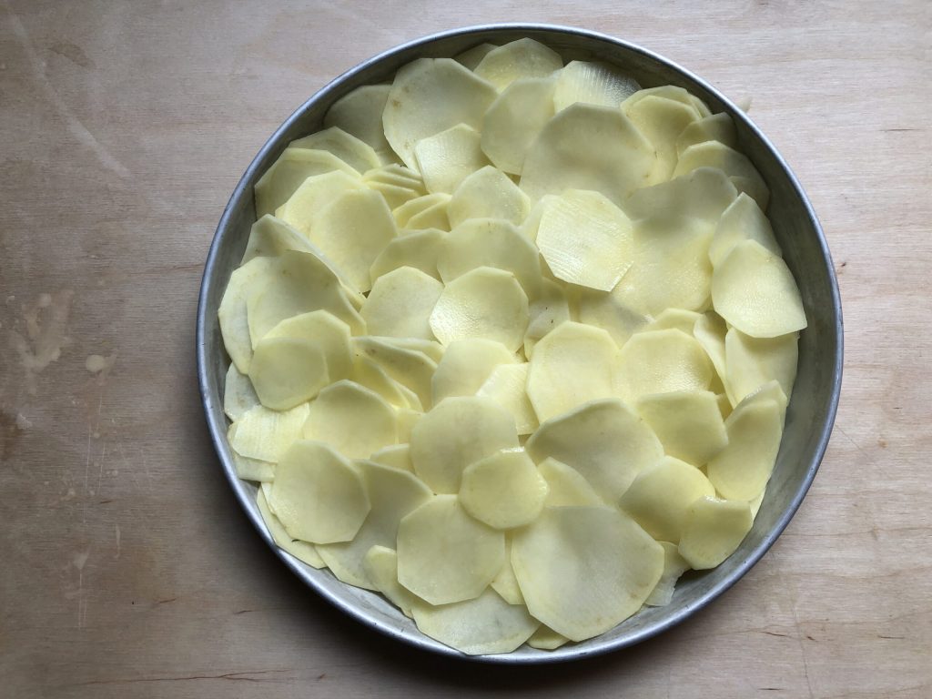 Kartoffeln schälen, waschen, mit Küchenpapier trocken tupfen und mit einer Mandoline in dünne Scheiben schneiden.