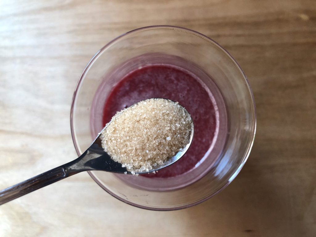 Den erhaltenen Saft in das Glas gießen, einen Teelöffel Rohrzucker hinzufügen und sorgfältig umrühren, bis der Zucker vollständig aufgelöst ist. Wenn Sie es vorziehen, können Sie auf den Zucker verzichten. Dies hängt vom persönlichen Geschmack ab.
