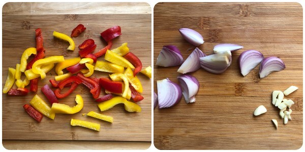 In der Zwischenzeit die Paprika waschen, alle Samen und inneren weißen Fasern entfernen und in nicht zu kleine Streifen schneiden.