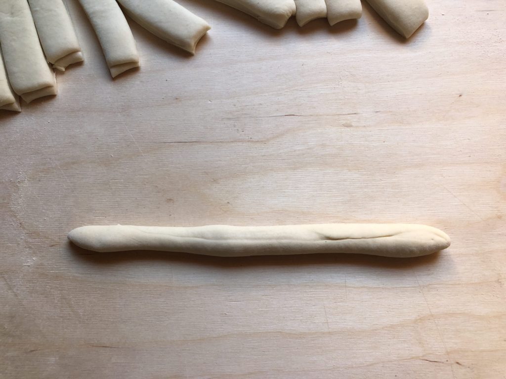 Formen Sie aus jedem Streifen eine Schnur von etwa 25 cm Länge, indem Sie wie bei Gnocchi vorgehen.
