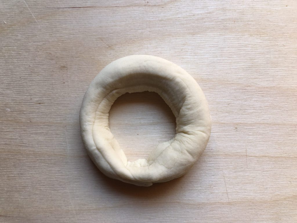 Legen Sie die Kringel nach und nach auf die mit Backpapier ausgelegten Backbleche (es werden zwei benötigt und es sind zwei Chargen erforderlich).