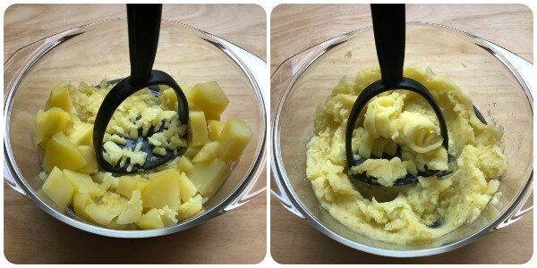 Sobald sie gekocht sind, durch den Kartoffelstampfer drücken und das Püree in eine große Schüssel sammeln. Wenn Sie sie in der Mikrowelle gekocht haben, entfernen Sie das Wasser am Boden des Behälters.