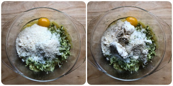 Die Zucchini abschneiden, waschen, mit Küchenpapier abtrocknen und mit einer Reibe mit großen Löchern in Julienne schneiden. Dann gut mit einem sauberen Küchentuch auspressen, um überschüssige Vegetationsflüssigkeit zu entfernen.