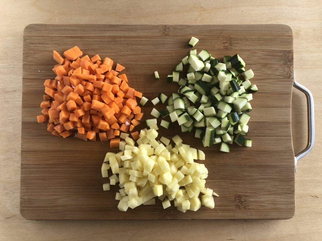Die Karotte abschneiden und schaben. Auch die Zucchini abschneiden. Die Kartoffel schälen. Alle diese Gemüse gut waschen, mit Küchenpapier trocken tupfen und in nicht zu kleine Würfel schneiden.