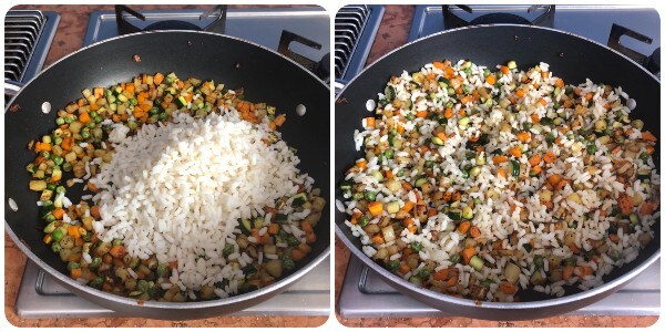 Unten habe ich die Menge der Zutaten angegeben, die ich verwendet habe, aber man muss nicht zu genau mit den Mengen sein: Wichtig ist, ein gutes Gleichgewicht zwischen Reis und Gemüse zu halten. Sie können die Mengen nach Ihrem persönlichen Geschmack oder nach dem, was Sie im Kühlschrank haben, erhöhen oder verringern und auch je nachdem, wie viel gekochter Reis zur Verfügung steht.