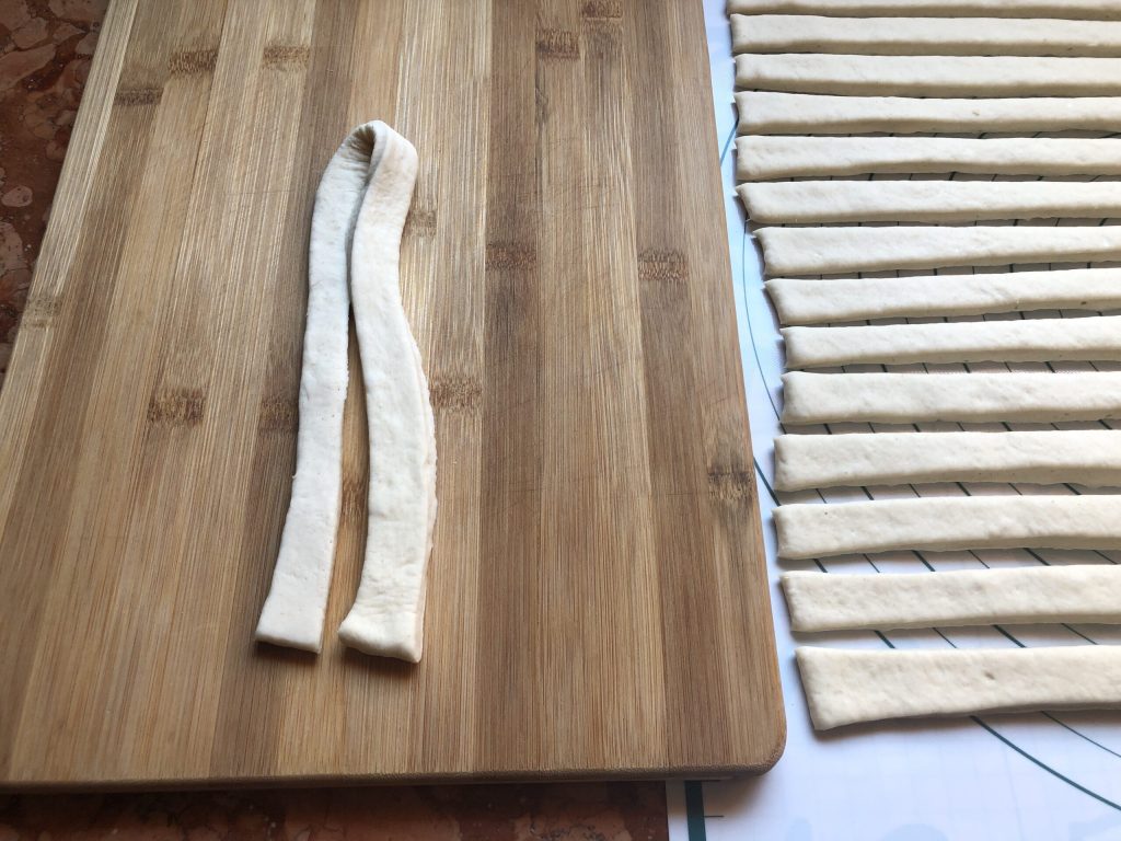Mit einem Pizzaschneider Streifen von etwa 1,5 cm Breite schneiden.
