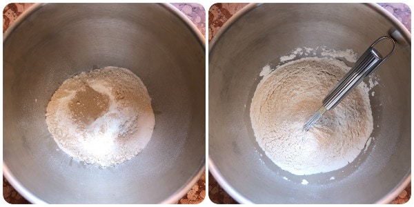 Das Mehl in die Schüssel der Küchenmaschine geben, die Hefe und den Zucker hinzufügen und mit einem kleinen Handschneebesen vermischen.