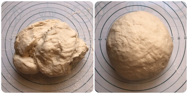 Den Teig auf eine leicht bemehlte Arbeitsfläche geben, einige Augenblicke mit den Händen kneten und zu einer Kugel formen.
