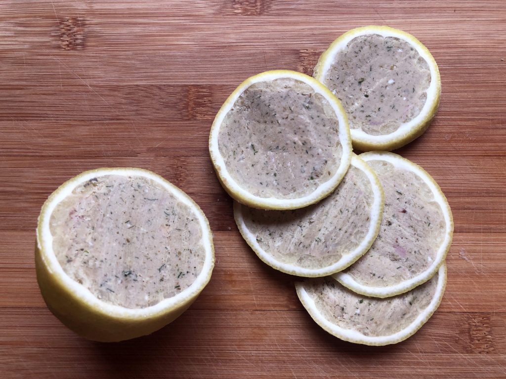 Die gefüllten Zitronen kurz vor dem Servieren aus dem Gefrierschrank nehmen und, wenn sie leicht weich geworden sind, in Scheiben schneiden (Ich betone ‚leicht‘, da sie noch etwas fest sein sollten, um das Schneiden zu erleichtern). Ich habe einen Aufschnitt verwendet.