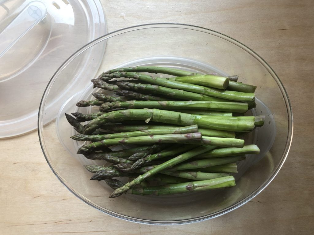 Nach der Garzeit den Spargel aus dem Dampfgarer nehmen und mit Küchenpapier trocken tupfen.