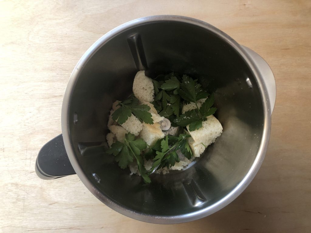 In der Zwischenzeit das alte Brot in Stücke gebrochen, die geschälte und vom inneren Kern befreite Knoblauchzehe, eine Prise Salz und die gewaschenen und getrockneten Petersilienblätter in einen Zerkleinerer geben.