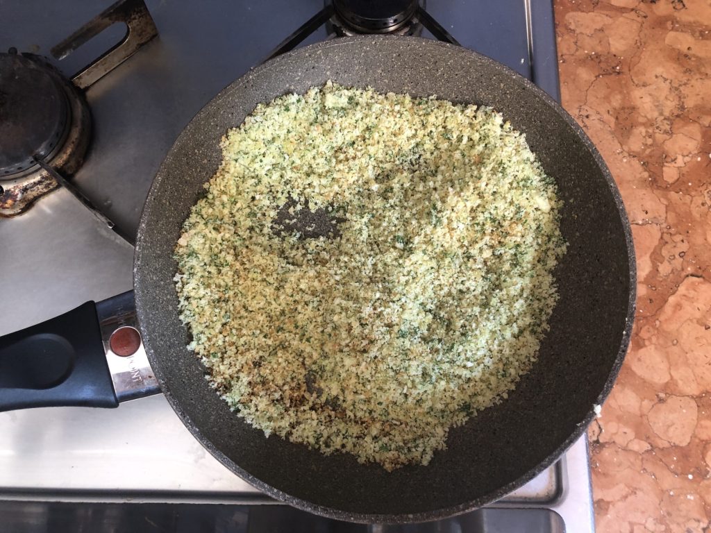 Erhitzt in einer kleinen Pfanne ein paar Esslöffel Öl und röstet darin die aromatisierte Brotkrümel.