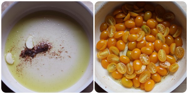 In einem großen Topf etwas Öl erhitzen und den Knoblauch darin anbraten. Wenn er zu brutzeln beginnt, das Sardellenfilet hinzufügen und zerdrückt mit einem Löffelrücken schmelzen lassen, dann die gelben Tomaten hinzufügen.