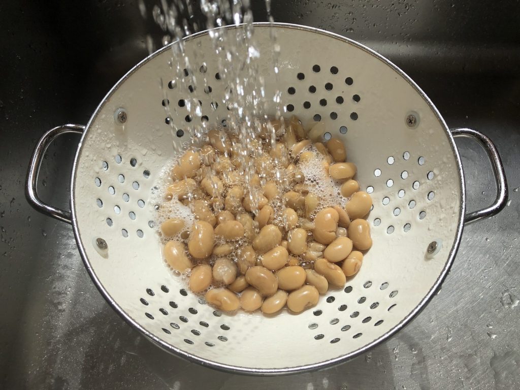 • Die weißen Bohnen aus ihrer Konservierungsflüssigkeit abtropfen lassen und unter reichlich fließendem Wasser abspülen.